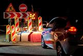 Начало автомобильного движения по Крымскому мосту. Автомобиль перед дорожными знаками "проезда нет", "дорожные работы.
