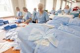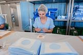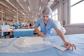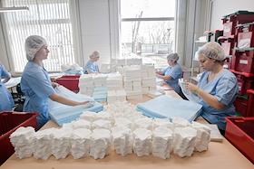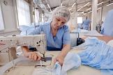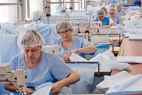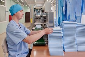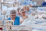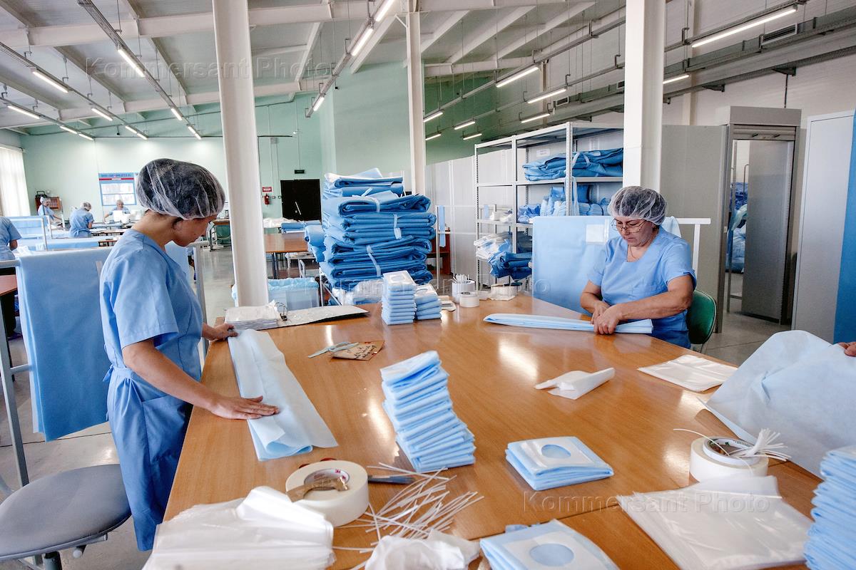 Рабочие предприятия ООО "Здравмедтех-Новосибирск" во время работы в цехе по производству одноразовой медицинской одежды и белья.