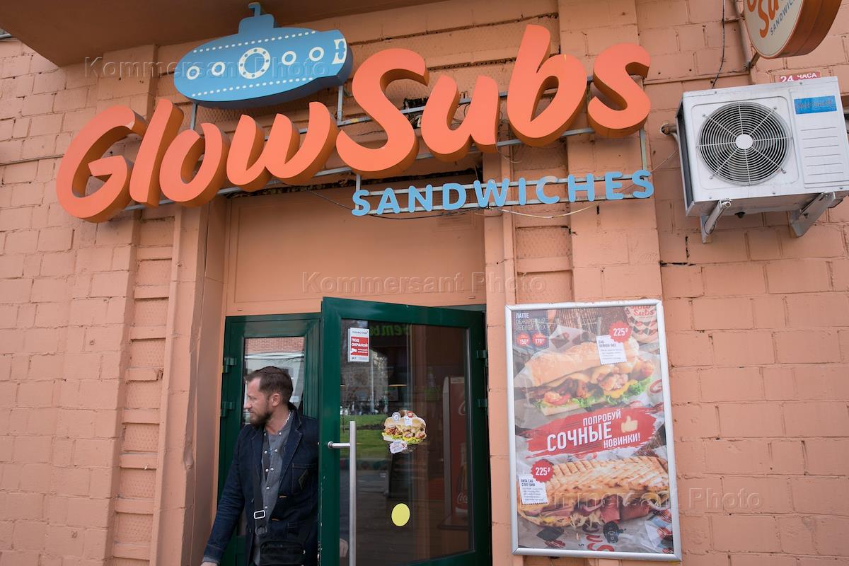 Жанровая фотография. Мужчина выходит из закусочной Glow Subs.