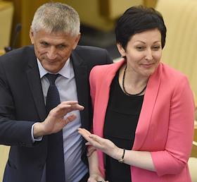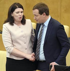 Пленарное заседание Государственной думы (ГД) России. Члены комитета ГД России по труду, социальной политике и делам ветеранов Владимир Мельник (слева) и Ольга Павлова (справа) во время заседания.