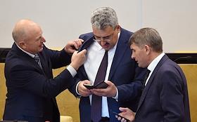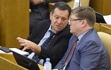 Пленарное заседание Государственной думы (ГД) России. Член комитета ГД России по региональной политике и проблемам Севера и Дальнего Востока Иван Фирюлин (слева) и член комитета ГД России по федеративному устройству и вопросам местного самоуправления Леонид Черкесов (в центре) во время заседания.