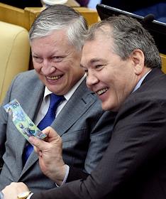 Пленарное заседания Государственной думы (ГД) России. Жанровая фотография. Депутаты с новыми 100 рублевыми купюрами, посвященными Чемпионату мира по футболу в России 2018 году.