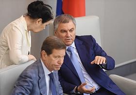 Пленарное заседание Государственной думы (ГД) России. Слева направо: председатель комитета ГД России по жилищной политике и жилищно-коммунальному хозяйству Галина Хованская, первый заместитель председателя ГД России Александр Жуков и председатель ГД России Вячеслав Володин во время заседания.
