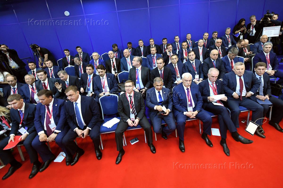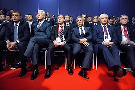 XXII Петербургский международный экономический форум (ПМЭФ). Презентация результатов национального рейтинга состояния инвестиционного климата в регионах России. Слева направо: губернатор Тульской области Алексей Дюмин, мэр Москвы Сергей Собянин, министр строительства и жилищно-коммунального хозяйства Владимир Якушев, президент Татарстана Рустам Минниханов и губернатор Санкт-Петербурга Георгий Полтавченко на презентации.