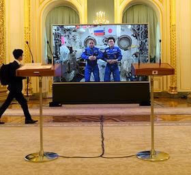 Сеанс прямой связи премьер-министра Японии Синдзо Абэ и президента России Владимира Путина с Международной космической станцией (МКС) в Кремле.