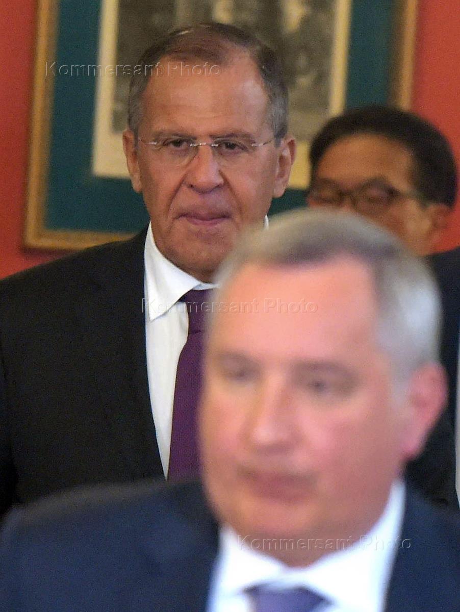 Министр иностранных дел России Сергей Лавров (в центре) во время церемонии подписания совместных документов по итогам российско-японских переговоров президента России Владимира Путина с премьер-министром Японии Синдзо Абэ в Кремле.