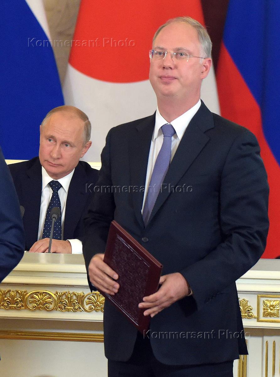 Церемония подписания совместных документов по итогам российско-японских переговоров. Президент России Владимир Путин (слева) и генеральный директор Российского фонда прямых инвестиций (РФПИ) Кирилл Дмитриев (справа) во время церемонии в Кремле.