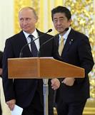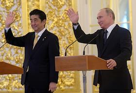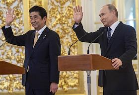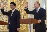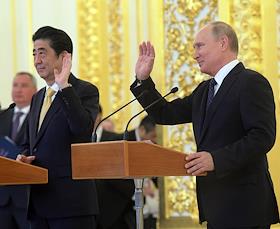 Церемония подписания совместных документов по итогам российско-японских переговоров. Премьер-министр Японии Синдзо Абэ (слева) и президент России Владимир Путин (справа) во время церемонии в Кремле.