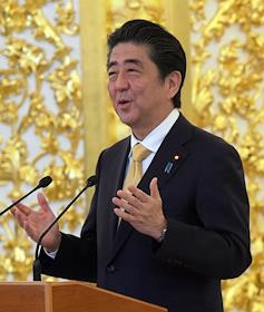 Церемония подписания совместных документов по итогам российско-японских переговоров. Премьер-министр Японии Синдзо Абэ во время пресс-конференции в Кремле.