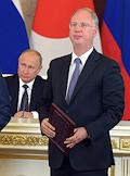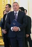 Генеральный директор Государственной корпорации по космической деятельности "Роскосмос" Дмитрий Рогозин (в центре) во время церемонии подписания совместных документов по итогам российско-японских переговоров президента России Владимира Путина с премьер-министром Японии Синдзо Абэ в Кремле.