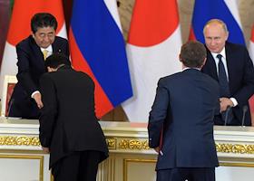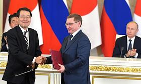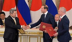 Церемония подписания совместных документов по итогам российско-японских переговоров. Слева направо: премьер-министр Японии Синдзо Абэ, министр строительства, инфраструктуры, транспорта и туризма Японии Коиши Есида, министр строительства и жилищно-коммунального хозяйства России Владимир Якушев и президент России Владимир Путин во время церемонии в Кремле.