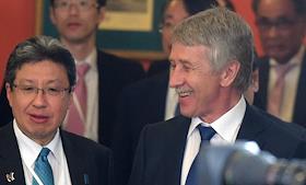 Церемония подписания совместных документов по итогам российско-японских переговоров. Председатель правления, член совета директоров компании "Новатэк" Леонид Михельсон (справа) во время церемонии в Кремле.