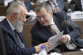 Заседание Президиума Российской академии наук (РАН). Член комитета Государственной думы России по международным делам Артур Чилингаров (слева) и директор Российского фонда фундаментальных исследований (РФФИ) и Института проблем лазерных и информационных технологий, академик РАН Владислав Панченко (справа) во время заседания.