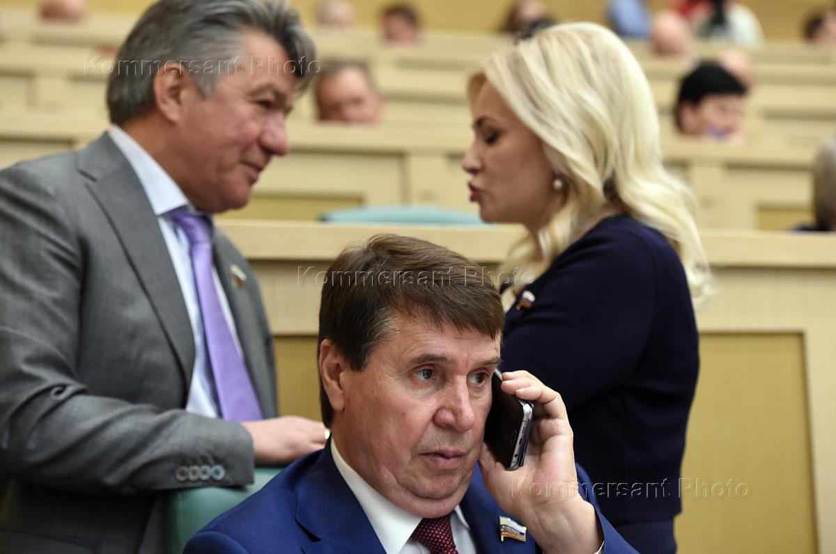 Пленарное заседание Совета Федерации (СФ) России. Представитель в СФ России от законодательного (представительного) органа государственной власти Республики Крым Сергей Цеков (в центре) перед началом заседания.
