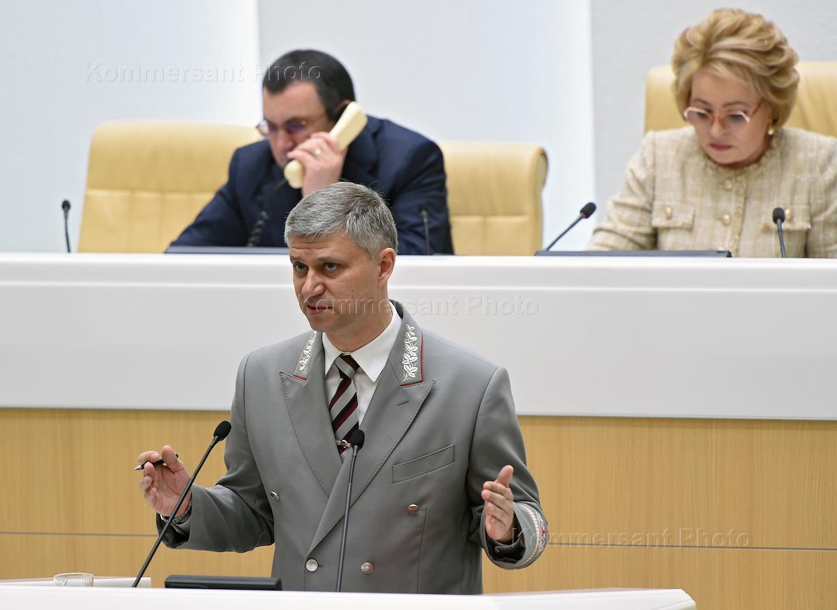 Пленарное заседание Совета Федерации (CФ) России. Первый заместитель председателя Совета Федерации Николай Федоров (справа) и уполномоченный по правам человека в России Татьяна Москалькова (в центре) во время заседания.