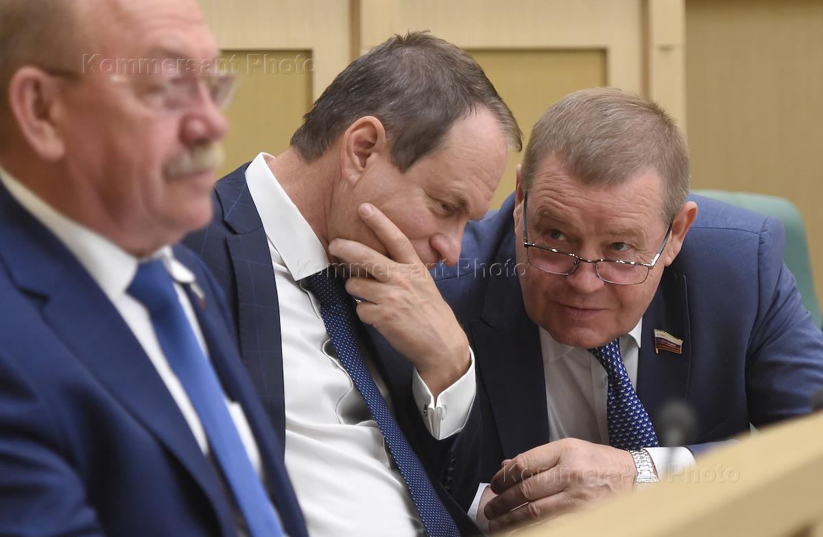 Пленарное заседание Совета Федерации (СФ) России. Слева направо: представитель от законодательного (представительного) органа государственной власти Астраханской области в СФ России Геннадий Орденов, представитель от исполнительного органа государственной власти Астраханской области в СФ России Александр Башкин и представитель в СФ России от законодательного (представительного) органа государственной власти Белгородской области Иван Кулабухов во время заседания.