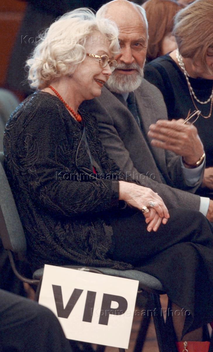 Поэт Николай Добронравов (слева) и композитор Александра Пахмутова (справа) на церемонии вручения премии "Российский национальный Олимп" в Государственном Кремлевском дворце.