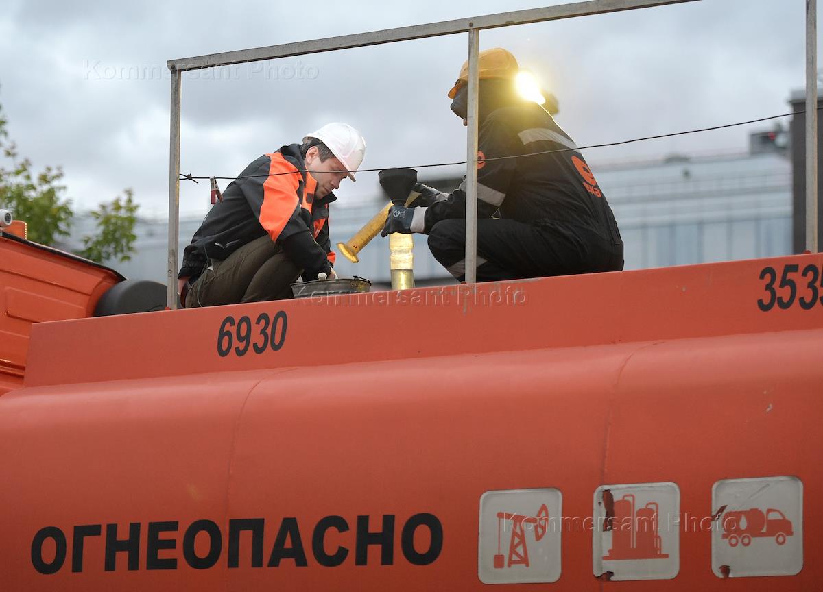 Жанровая фотография. Автозаправочная станция (АЗС). Сотрудники АЗС на бензовозе перед сливом бензина в бак АЗС.