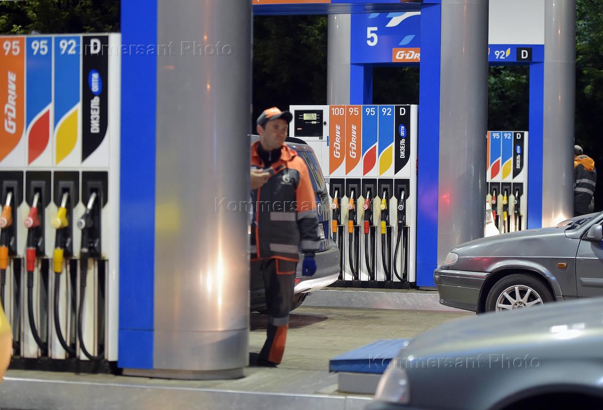 Жанровая фотография. Автозаправочная станция (АЗС) компании "Газпромнефть". Заправщик во время работы на АЗС.