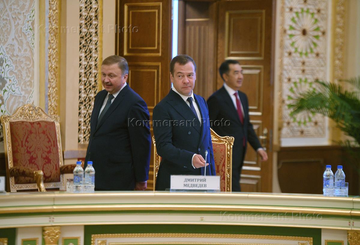 Рабочая поездка председателя правительства России Дмитрия Медведева в Таджикистан. Заседание совета глав правительств Содружества независимых государств (СНГ). Председатель правительства России Дмитрий Медведев (в центре) перед началом заседания.