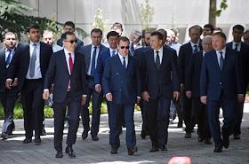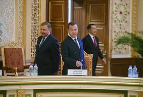 Рабочая поездка председателя правительства России Дмитрия Медведева в Таджикистан. Заседание совета глав правительств Содружества независимых государств (СНГ). Председатель правительства России Дмитрий Медведев (в центре) перед началом заседания.