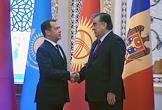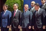 Рабочая поездка председателя правительства России Дмитрия Медведева в Таджикистан. Заседание совета глав правительств Содружества независимых государств (СНГ). Слева направо на переднем плане: премьер-министр Киргизии Мухаммедкалый Абылгазиев, премьер-министр Казахстана Бакытжан Сагинтаев, председатель правительства России Дмитрий Медведев и премьер-министр Таджикистана, председатель Совета глав правительств СНГ Кохир Расулзода во время совместного фотографирования перед началом заседания.
