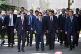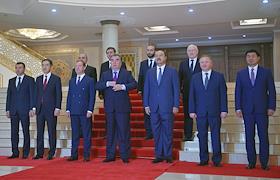 Рабочая поездка председателя правительства России Дмитрия Медведева в Таджикистан. Заседание совета глав правительств Содружества независимых государств (СНГ). Слева направо на переднем плане: премьер-министр Таджикистана, председатель Совета глав правительств СНГ Кохир Расулзода, премьер-министр Казахстана Бакытжан Сагинтаев, председатель правительства России Дмитрий Медведев, президент Таджикистана Эмомали Рахмон, премьер-министр Узбекистана Абдулла Арипов, премьер-министр Белоруссии Андрей Кобяков и премьер-министр Киргизии Мухаммедкалый Абылгазиев во время совместного фотографирования перед началом заседания.