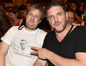 29-й Российский кинофестиваль "Кинотавр". Второй день. Актер Максим Виторган (справа) и главный редактор журнала "Искусство кино", кинокритик Антон Долин (слева) перед премьерой фильма "Мира" режиссера Дениса Шабаева.