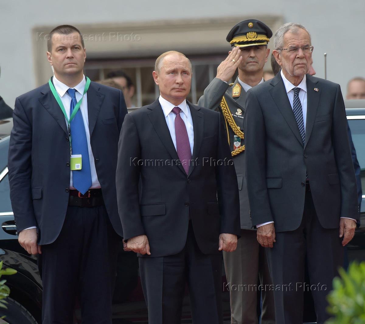Russian president Vladimir Putin work trip to Austria. Russian President Vladimir Putin (center) and Austrian president Alexandr Van der Bellen (right) during the official meeting in Hofburg palace.