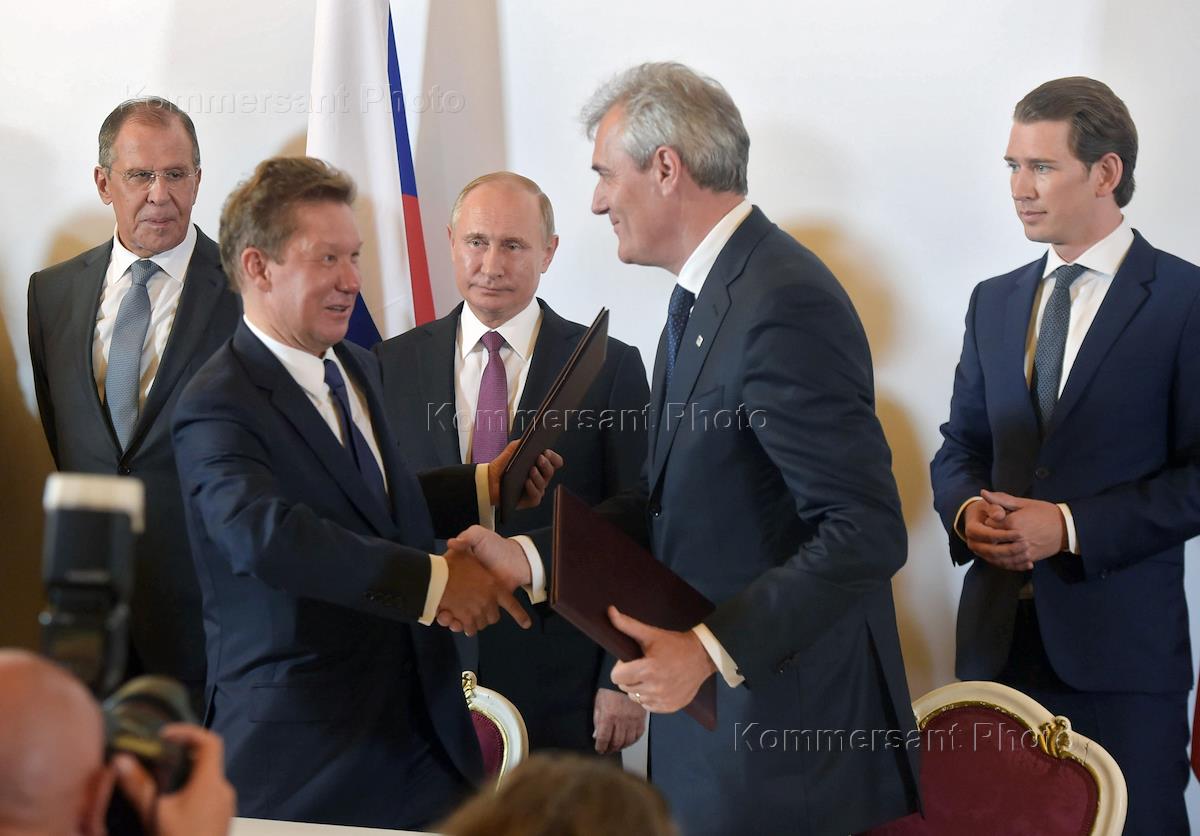 Рабочая поездка президента России Владимира Путина в Австрию. Слева направо: министр иностранных дел России Сергей Лавров, правления, заместитель председателя совета директоров ПАО "Газпром" Алексей Миллер, президент России Владимир Путин и председатель правления, генеральный директор компании OMV AG Райнер Зеле и федеральный канцлер Австрии Себастьян Курц на церемонии подписания совместных документов.