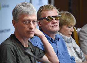 XXIX Российский открытый кинофестиваль "Кинотавр". Четвертый день. Пресс-конференция фильма съемочной группы фильма "Ван Гоги". Режиссер Сергей Ливнев (слева) актер Алексей Серебряков (спрва) на пресс-конференции.