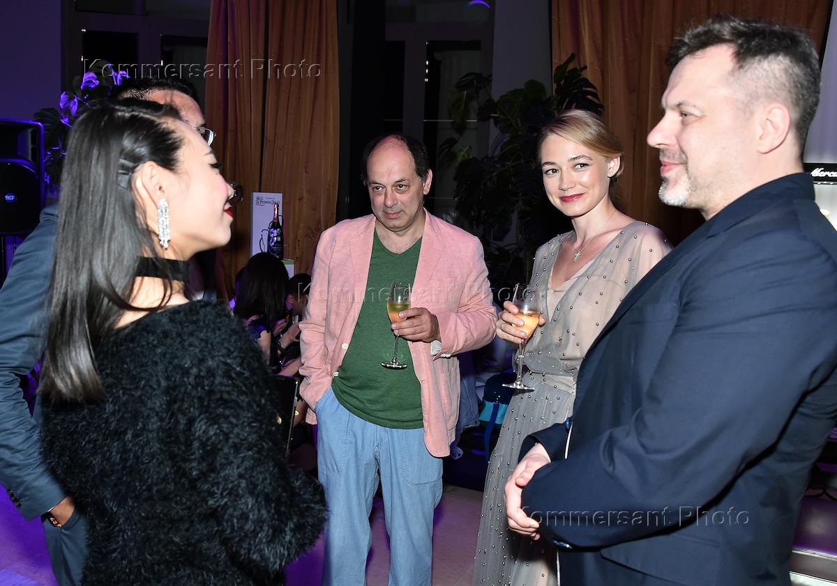XXIX Российский открытый кинофестиваль "Кинотавр". Гала-ужин Cinema Night в честь жюри, организованный журналом InStyle в отеле "Rodina Grand Hotel&Spa". Слева направо: китайская актриса Ян Гэ, продюсер Евгений Гиндилис и актриса Оксана Акиньшина и композитор Игорь Вдовин на ужине.