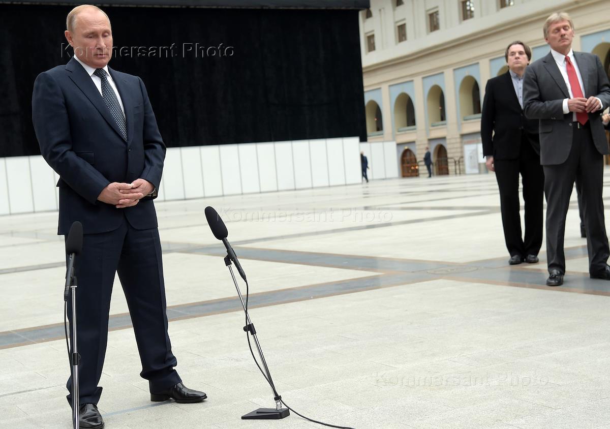 Annual special program "Direct Line with Russian President Vladimir Putin". Russian President Vladimir Putin (left) speaking to journalists. Deputy head of Russian presidential administration - presidential spokesman Dmitry Peskov (right) and General director of "One" Channel Konstantin Ernst (center) after the program in Gostiny Dvor.