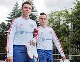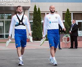 Открытая тренировка сборной России по футболу при подготовке к Чемпионату мира по футболу 2018 FIFA прошла в Учебно-тренировочном центре (УТЦ) "Новогорск". Игроки сборной России Владимир Гранат (слева) и Федор Кудряшов (справа) перед началом тренировки.