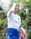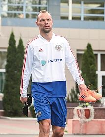 Открытая тренировка сборной России по футболу при подготовке к Чемпионату мира по футболу 2018 FIFA прошла в Учебно-тренировочном центре (УТЦ) "Новогорск". Игрок сборной России Сергей Игнешевич перед началом тренировки.