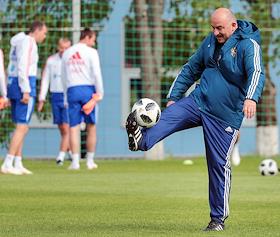Открытая тренировка сборной России по футболу при подготовке к Чемпионату мира по футболу 2018 FIFA прошла в Учебно-тренировочном центре (УТЦ) "Новогорск". Главный тренер сборной России Станислав Черчесов во время тренировки.