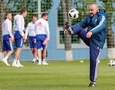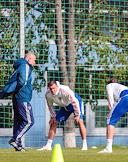 Открытая тренировка сборной России по футболу при подготовке к Чемпионату мира по футболу 2018 FIFA прошла в Учебно-тренировочном центре (УТЦ) "Новогорск". Главный тренер сборной России Станислав Черчесов (слева) и игрок сборной России Артем Дзюба (в центре) во время тренировки.