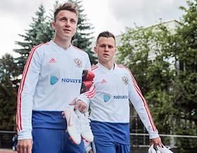Открытая тренировка сборной России по футболу при подготовке к Чемпионату мира по футболу 2018 FIFA прошла в Учебно-тренировочном центре (УТЦ) "Новогорск". Игроки сборной России Александр Головин (слева), Денис Черышев (справа) перед началом тренировки.