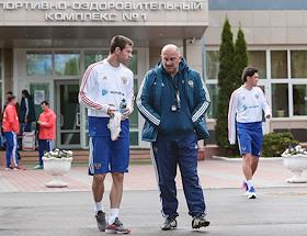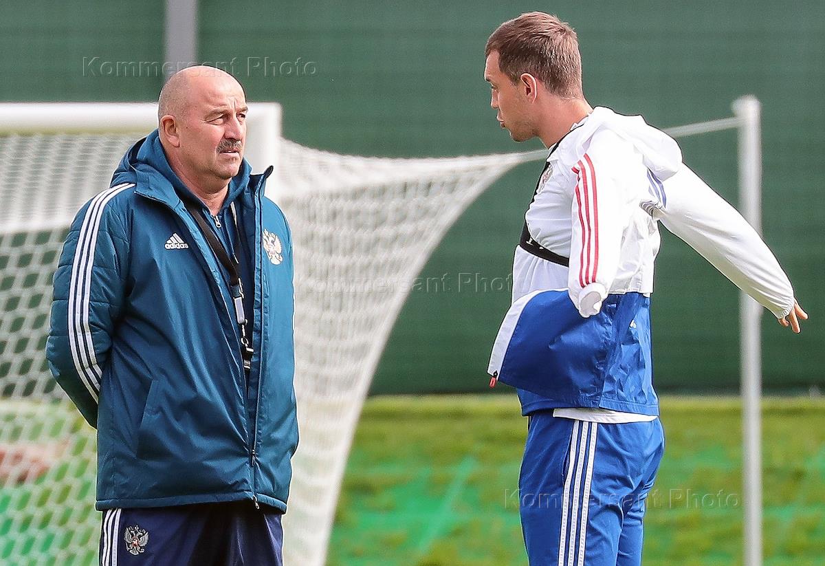 Открытая тренировка сборной России по футболу при подготовке к Чемпионату мира по футболу 2018 FIFA прошла в Учебно-тренировочном центре (УТЦ) "Новогорск". Главный тренер сборной России Станислав Черчесов (слева) и игрок сборной России Артем Дзюба (справа) во время тренировки.