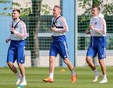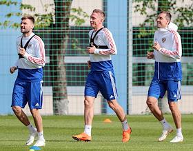 Открытая тренировка сборной России по футболу при подготовке к Чемпионату мира по футболу 2018 FIFA прошла в Учебно-тренировочном центре (УТЦ) "Новогорск". Слева направо: игроки сборной России Владимир Гранат, Андрей Семенов и Артем Дзюба во время тренировки.