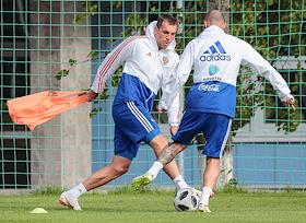 Открытая тренировка сборной России по футболу при подготовке к Чемпионату мира по футболу 2018 FIFA прошла в Учебно-тренировочном центре (УТЦ) "Новогорск". Игроки сборной России Артем Дзюба (слева) и Фёдор Кудряшов (справа) во время тренировки.