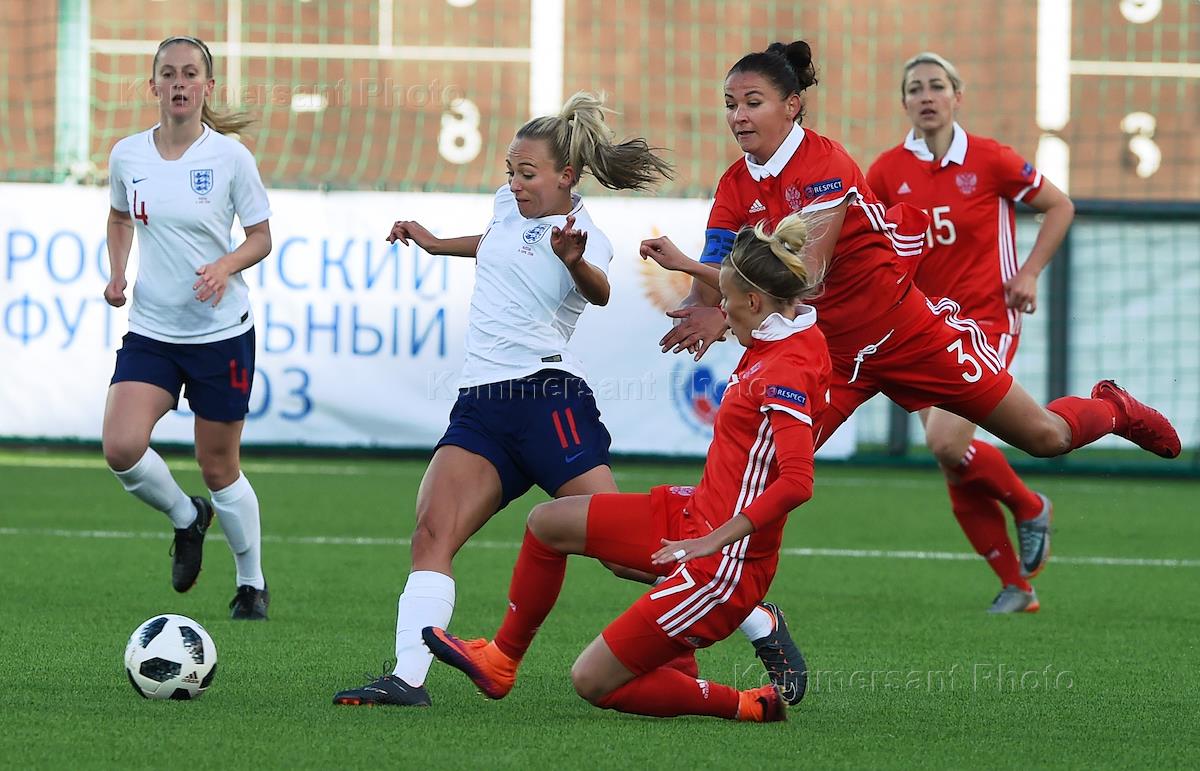 Чемпионат Мира по футболу среди женщин 2019. Квалификация. Группа 1. Матч между сборными России и Англии прошел на стадионе "Сапсан Арена". Игрок сборной Англии Никита Паррис (вторая слева) во время матча.