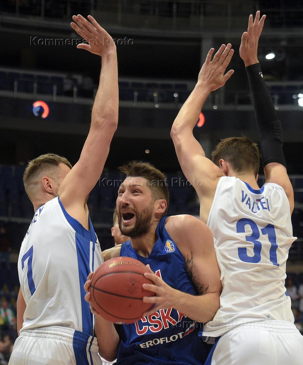 "Финал Четырех" по баскетболу Единой Лиги ВТБ. Полуфинал. Матч между командами ЦСКА (Москва) и "Зенит" (Санкт-Петербург) на арене "ВТБ Ледовый Дворец". Игрок команды ЦСКА Никита Курбанов (в центре) во время матча.