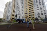 Новое жилье в рамках программы реновации. Мама с ребенком на детской площадке возле дома, построенного в рамках программы реновации.