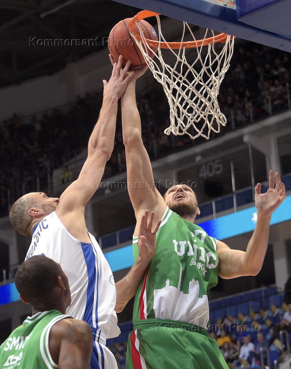 "Финал Четырех" Единой Лиги ВТБ по баскетболу. Матч за третье место между командами УНИКС (Казань) и "Зенит" (Санкт-Петербург) прошел на арене "ВТБ Ледовый Дворец". Игроки команды УНИКС Евгений Колесников (второй слева), Стефан Ласме (справа), игроки команды "Зенит" Шейн Уиттингтон (второй слева) и Марко Симонович (слева) во время матча.
