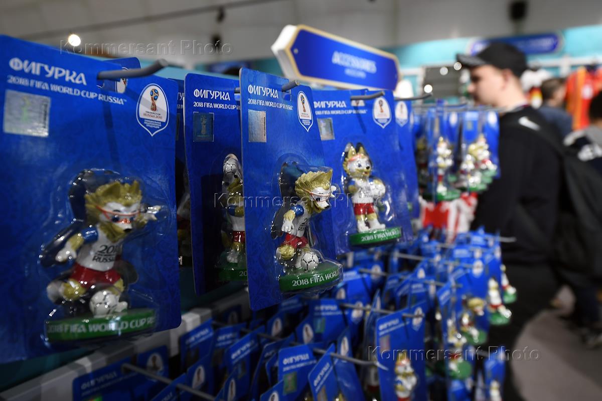 Подготовка к Чемпионату мира по футболу 2018 FIFA. Церемония открытия Фестиваля болельщиков FIFA Fan Fest 2018 прошла на Воробьевых горах. Магазин сувенирной продукции Чемпионату мира по футболу.