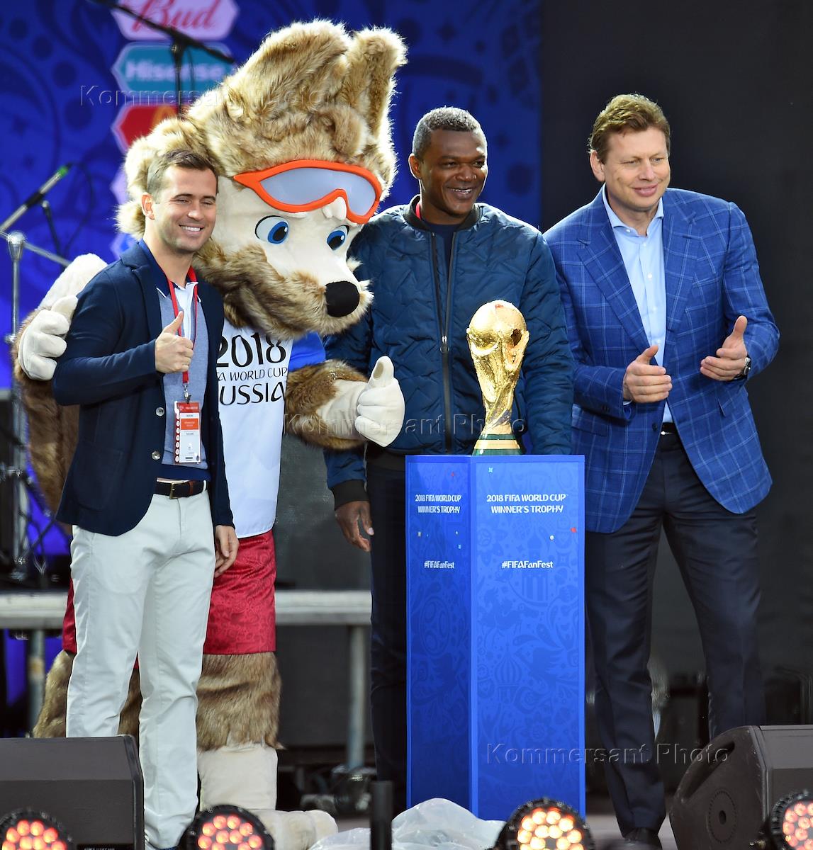 Подготовка к Чемпионату мира по футболу 2018 FIFA. Церемония открытия Фестиваля болельщиков FIFA Fan Fest 2018 прошла на Воробьевых горах. Зрители во время церемонии. Слева направо: бывший игрок сборной России по футболу Александр Кержаков, французский футболист Марсель Десайи и руководитель Департамента спорта и туризма города Москвы Николай Гуляев во время церемонии.