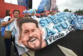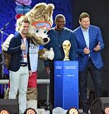 Подготовка к Чемпионату мира по футболу 2018 FIFA. Церемония открытия Фестиваля болельщиков FIFA Fan Fest 2018 прошла на Воробьевых горах. Зрители во время церемонии. Слева направо: бывший игрок сборной России по футболу Александр Кержаков, французский футболист Марсель Десайи и руководитель Департамента спорта и туризма города Москвы Николай Гуляев во время церемонии.