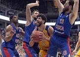 "Финал Четырех" Единой Лиги ВТБ по баскетболу. Финал. Матч между командами ЦСКА (Москва) и "Химки" (Химки) прошел на арене "ВТБ Ледовый Дворец". Игроки команды ЦСКА Кайл Хайнс (слева), Никита Курбанов (второй слева), Серхио Родригес (справа) и игрок команды "Химки" Энтони Гилл (второй справа) во время матча.