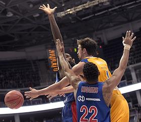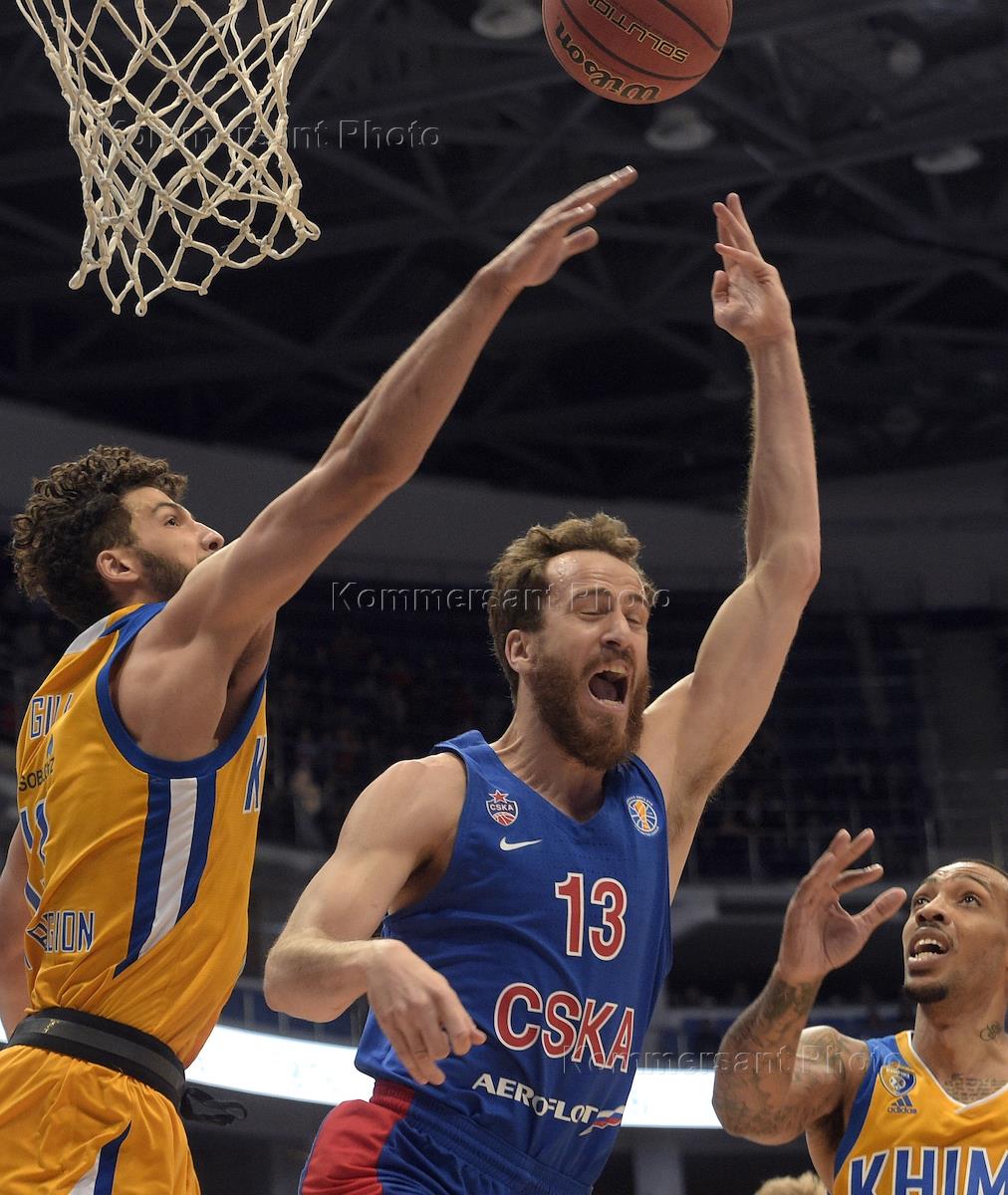 "Финал Четырех" Единой Лиги ВТБ по баскетболу. Финал. Матч между командами ЦСКА (Москва) и "Химки" (Химки) прошел на арене "ВТБ Ледовый Дворец". Игрок команды ЦСКА Кори Хиггинс (слева) и игрок команды "Химки" Энтони Гилл (второй справа) во время матча.